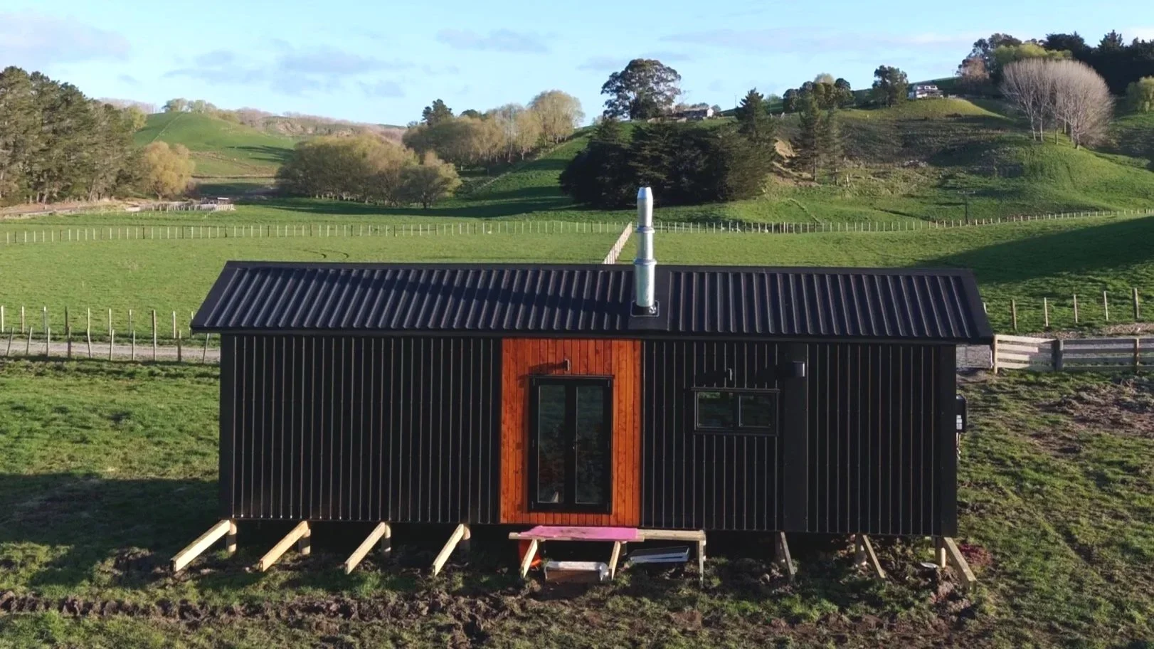 30m2 floor space, single level, mono pitch roof, one bedroom, fire place. Price approx. $90,000 +GST